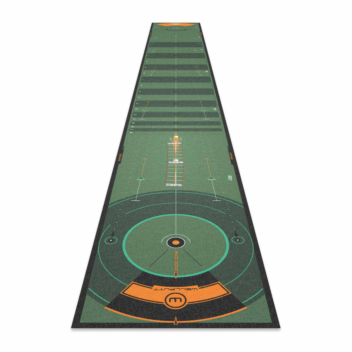 The 26ft Classic Wellputt training mat accurately replicates a medium-to-fast putting green surface with a rolling quality that is renowned as the leading scientifically accurate reproduction of a real-life green. The mat comes with patented visual aids designed to fine-tune your accuracy and consistency. As you train on long-distance putts beyond 16ft, you develop muscle memory of the correct aim and the right touch that's guaranteed to get you in or next to the cup.