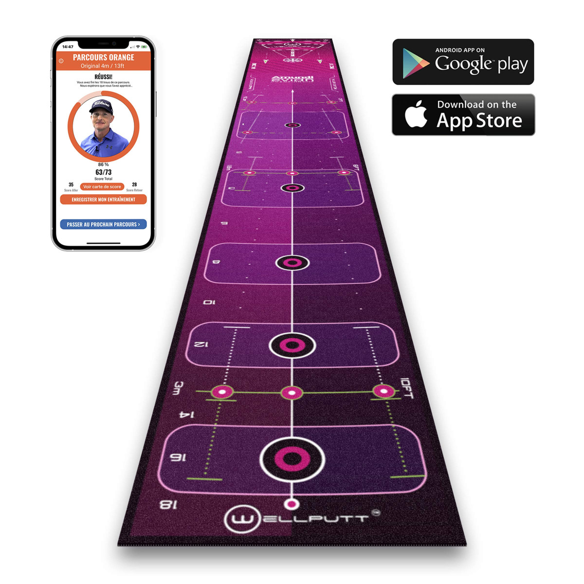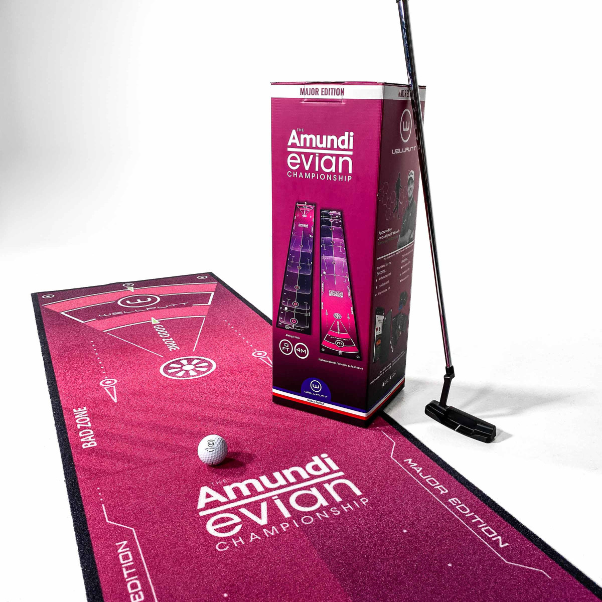 Ce tapis d'entraînement au putting de 4m est le fruit de la collaboration entre Wellputt et l'Evian Amundi Championship, seule compétition majeure féminine en Europe continentale. Retrouvez la qualité de roule Wellputt et travaillez votre précision et votre contrôle de distance avec ce tapis collector.